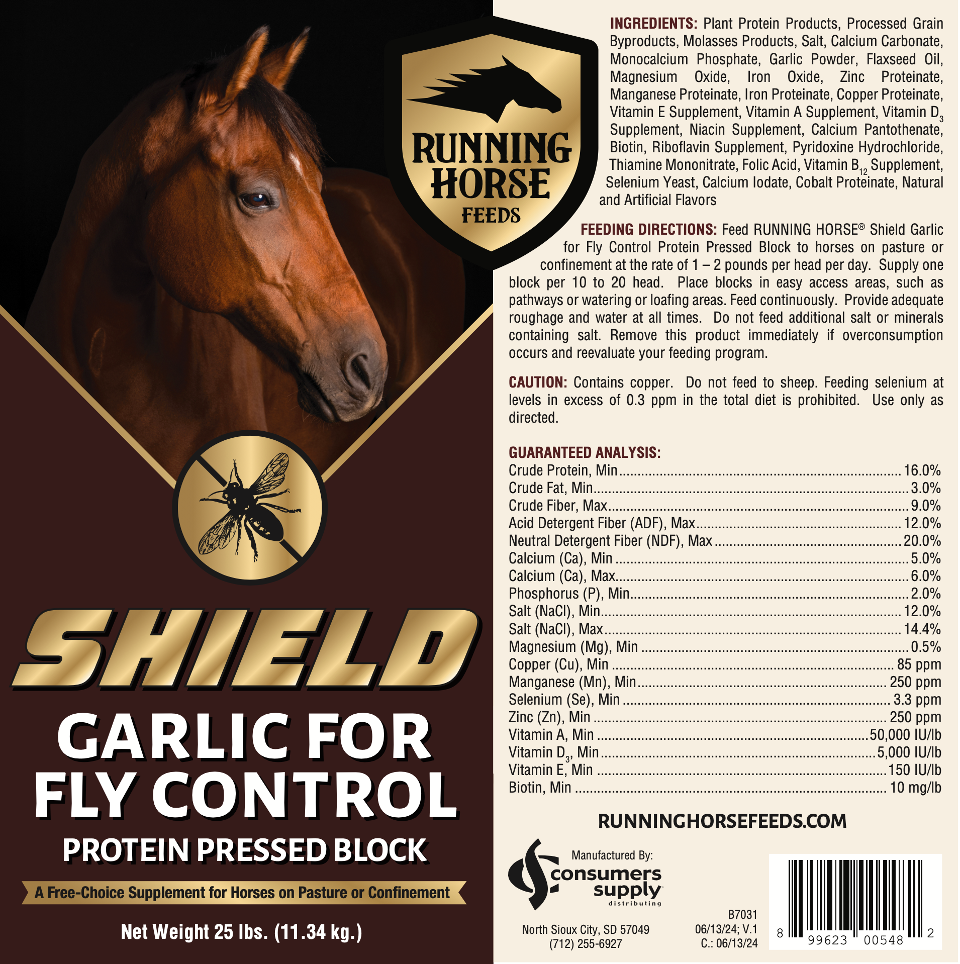 RUNNING HORSE - SHIELD EQUINE PROTEIN BLOCK W/ GARLIC 25Lb supports the daily needs of horses in maintenance or work.